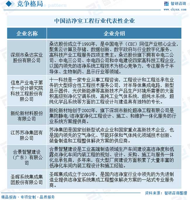 超潔凈環(huán)境控制又融合了風(fēng)險評估、生產(chǎn)認(rèn)證的概念和程序,加之潔凈技術(shù)跨行業(yè)、跨專業(yè)、跨學(xué)科的特點,使得潔凈室工程的難度和復(fù)雜性增加。因此對于潔凈室工程行業(yè)來說,優(yōu)化設(shè)計、現(xiàn)場施工環(huán)境的協(xié)調(diào)與管控、工程相關(guān)技術(shù)細(xì)節(jié)的經(jīng)驗積累,對客戶需求的理解和實現(xiàn),以及對設(shè)計變更的準(zhǔn)備和響應(yīng)程度等都是衡量潔凈室工程企業(yè)競爭能力的重要指標(biāo)。?目前,我國潔凈室工程行業(yè)競爭較為激烈,企業(yè)數(shù)量較多。其中,桑達(dá)股份、十一科技、蘇凈集團、新綸新材、柏誠股份、亞翔集成等設(shè)計研究院或建設(shè)承包企業(yè)在降低建造成本、提高潔凈室的穩(wěn)定性等方面占據(jù)優(yōu)勢,能提供高端潔凈室系統(tǒng)集成解決方案,位居行業(yè)領(lǐng)先地位。同時,行業(yè)內(nèi)還存在大量規(guī)模較小、技術(shù)水平與綜合解決方案能力有限的潔凈室工程企業(yè),普遍集中在對潔凈等級要求不高的低端市場。