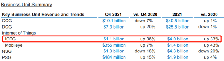在晶圓代工巨頭臺(tái)積電公布的財(cái)報(bào)中,2021年其手機(jī)業(yè)務(wù)營(yíng)收首次被HPC(大型高性能計(jì)算)業(yè)務(wù)超越,面向汽車板塊的營(yíng)收和訂單需求也猛增。 圖像傳感器芯片設(shè)計(jì)龍頭韋爾股份最新財(cái)報(bào)顯示,其半導(dǎo)體業(yè)務(wù)收入同比增長(zhǎng)18%,雖然智能手機(jī)CMOS占據(jù)營(yíng)收大頭,但業(yè)績(jī)?cè)鲩L(zhǎng)主要來(lái)源于車載CIS與安防CIS,尤其在安防領(lǐng)域?qū)崿F(xiàn)高達(dá)60%的業(yè)績(jī)?cè)鲩L(zhǎng)。 2021年物聯(lián)網(wǎng)事業(yè)部(IoTG)成為國(guó)際半導(dǎo)體巨頭英特爾增長(zhǎng)最快的業(yè)務(wù),同比增長(zhǎng)33%,同時(shí)汽車自動(dòng)駕駛業(yè)務(wù)也增速驚人,反觀主營(yíng)PC終端的CCG部門(mén)業(yè)績(jī)僅增1個(gè)百分點(diǎn)。