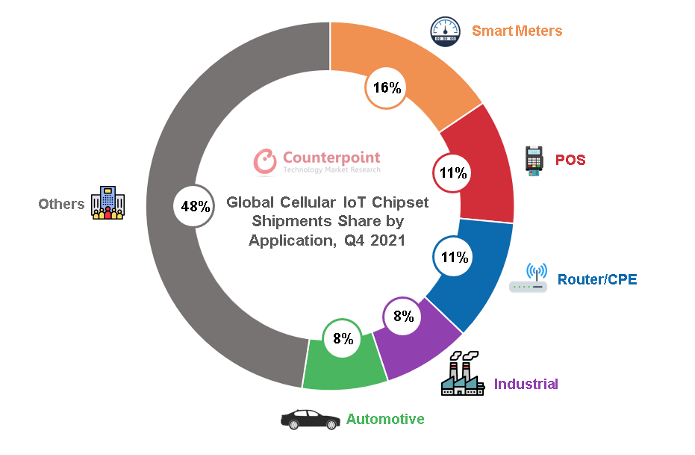 在蜂窩物聯(lián)網(wǎng)芯片中,當(dāng)前應(yīng)用規(guī)模最大的是低速率的NB-IoT芯片(占比60%),NB-IoT也是我國(guó)主推的物聯(lián)網(wǎng)連接方式,應(yīng)用在智能儀器表盤(pán)、資產(chǎn)追蹤等場(chǎng)景。其次是中速率的2G/3G(占比30%),用于移動(dòng)支付、智能穿戴和智能家居中。4G Cat.1和5G大約占比10%, 5G模組的成本過(guò)高,加上大部分物聯(lián)網(wǎng)終端對(duì)傳輸速率的需求性不高,5G在物聯(lián)網(wǎng)終端的應(yīng)用占比較低,主要是自動(dòng)駕駛和視頻監(jiān)控領(lǐng)域,但隨著2G/3G轉(zhuǎn)網(wǎng),Cat.1在智能支付、定位追蹤、車載終端、視頻監(jiān)控領(lǐng)域的高速增長(zhǎng),正逐漸打破蜂窩物聯(lián)網(wǎng)6:3:1的格局。從應(yīng)用場(chǎng)景來(lái)看,智能表計(jì)、POS支付、路由器/CPE、工業(yè)、汽車是蜂窩物聯(lián)網(wǎng)芯片應(yīng)用最廣泛的前五大場(chǎng)景。