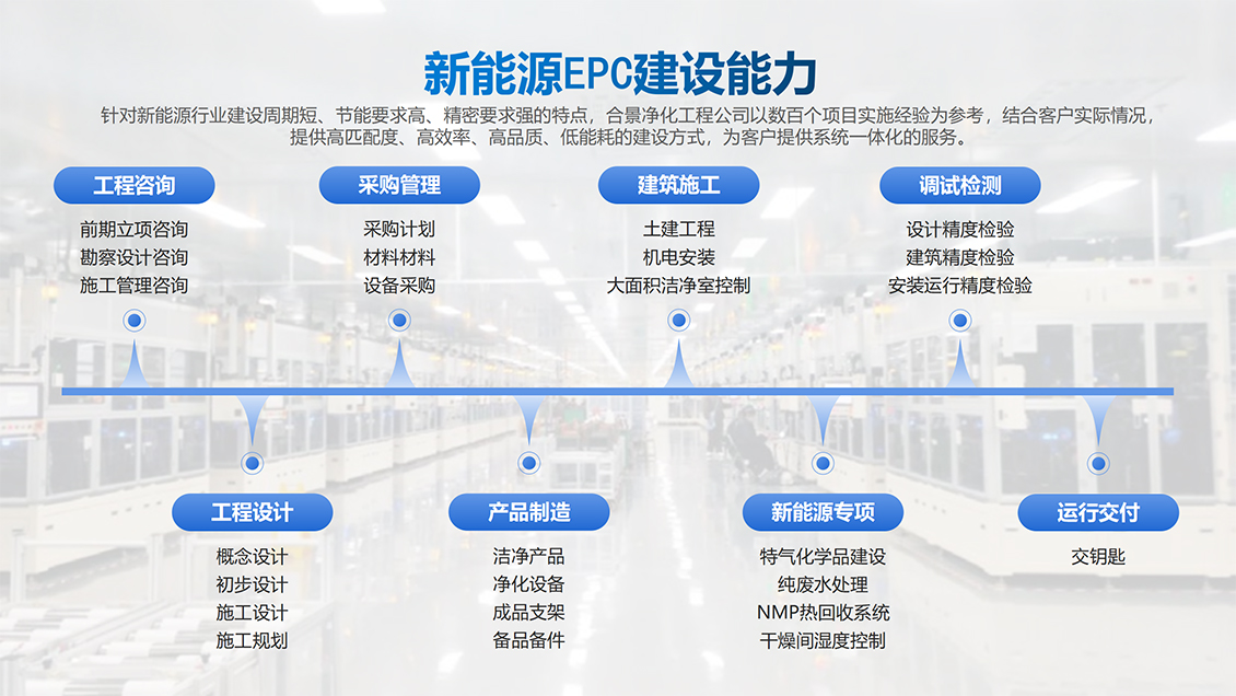 合景智慧建設(shè)是工業(yè)高端制造領(lǐng)域生產(chǎn)車間建設(shè)高潔凈度和低露點(diǎn)凈化車間內(nèi)裝工程的規(guī)劃、設(shè)計(jì)、采購、施工與服務(wù)一體化總承包商,多年來,在大型廠房建設(shè)方面積累了大量豐富的低凈化車間內(nèi)裝工程設(shè)計(jì)和施工經(jīng)驗(yàn),特別是在產(chǎn)能規(guī)劃、公用工程、環(huán)境工程(溫度、低露點(diǎn)、高潔凈度)等領(lǐng)域的制造、工藝流程、節(jié)能環(huán)保等提供完善的系統(tǒng)集成工程建設(shè)解決方案。